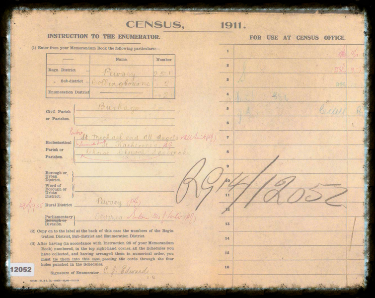 The 1911 Census. The Census took place on 2nd April 1911. Two Census Books were compiled for Burbage in the Pewsey Registration District (Sub-district Collingbourne) within Devizes or East Wilts District.